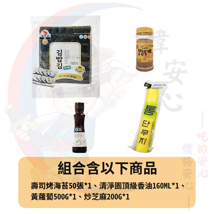 韓國食材 壽司烤海苔50張+清淨園頂級香油160ML+黃蘿蔔500G+炒芝麻200G